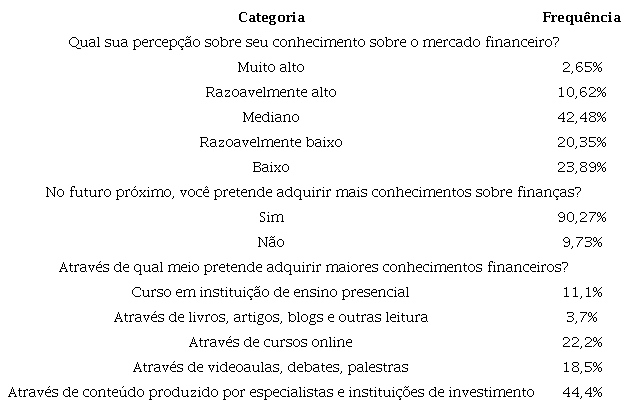 Em relação ao conhecimento percebido sobre o mercado financeiro, grande parte (44,24%) afirma que é baixo de alguma forma. Em oposição, apenas 13,27% afirmam que o conhecimento é de alguma forma alto. Esse resultado dos respondentes, ainda que restritos à amostra e não passíveis de generalização para a população em geral, estão em consonância com a intenção de adquirir mais conhecimentos sobre finanças (90,27%), e sustentam alguns argumentos pela necessidade de maior educação financeira, como Barros (2010), Potrich, Vieira e Kirch (2015), Gans, Gans, Oliveira, Moreira e Filho (2016), e Cunha (2020).