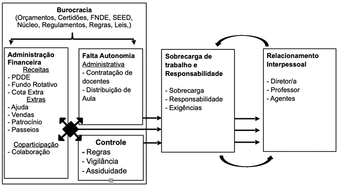 ABSTRACT: The authors propose a conceptual model relating aspects of bureaucratic dysfunction identified in the public administration. The authors use a case study from a recognized public school from Paraná, assessed with the highest IDEB of its local education system. The Theory of Bureaucracy and, specially, its criticisms directed, are the theoretical lens adopted to support the aspects of bureaucratic dysfunction that emerge from the case study. This qualitative study had three different sources of data collecting (semi-structured interviews, observations, and document analysis), investigated through Atlas T.I. Based on methodological procedures of Yin (2011) and Bardin (2006), the author develop five categories of analysis: control, financial administration, work overload, autonomy and interpersonal relationships. The results show that aspects of bureaucratic dysfunction lead to an increase in work overload, which consequently impair the interpersonal relationship among the school team (i.e. actors), and vice versa. Results offer new insights into how three relevant aspects of bureaucratic dysfunction (financial management, autonomy and control) impact on the workload and interpersonal relationships in the management of a public school. The findings also highlight how aspects of bureaucratic dysfunction when influencing school management.