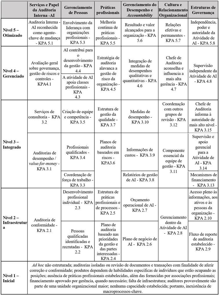 Os KPAs são blocos de construção que determinam a capacidade de uma atividade de auditoria interna. Eles identificam o que deve estar em vigor e sustentado no referido nível de capacidade antes da atividade de auditoria interna avançar para o próximo nível. Quando uma atividade de auditoria interna institucionalizou todos os KPAs associados a um determinado nível de capacidade de auditoria interna, considera-se atingido o nível (IIARF, 2009).