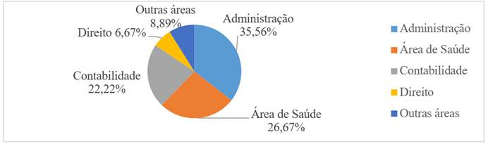 Dos servidores com titulação, a predominância é do curso de Administração com 16 respondentes (35,6%), contudo, outros cursos guardam relevância, como o da área de saúde e de contabilidade que, somados, representam 46,9%, o que demonstra que o órgão dispõe de profissionais de várias áreas de formação, importante para o desempenho das atividades de auditoria (Gráfico 1).