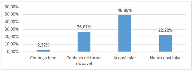 No que diz respeito ao nível de entendimento do modelo de capacidade IA-CM para a auditoria interna, as respostas demonstraram que a compreensão ao modelo está aquém de uma situação ideal para um órgão de auditoria interna, uma vez que o corpo técnico da auditoria interna deveria ter entendimentos consolidados sobre as práticas e procedimentos internacionais de avaliação da qualidade da auditoria e do Modelo IA-CM preconizado pelo Instituto dos Auditores Internos. Nesse sentido, quase a metade dos entrevistados (48,9%) somente ouviram falar e os que “nunca ouviram falar” representaram 22,2%, portanto, trata-se de um elevado percentual de desconhecimento desses dois grupos, que somados totalizam 71,1% do total dos respondentes, se levarmos em consideração a importância da temática para o órgão de auditoria.