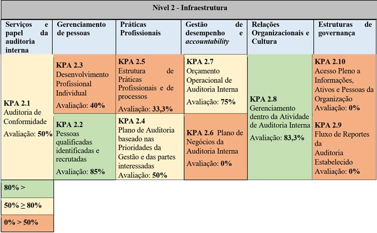 Nível 2 (infraestrutura): o planejamento de auditoria com base principalmente nas prioridades de gestão, as práticas e procedimentos da auditoria interna são executados de forma regular e repetidos e existe uma conformidade parcial com as Normas Internacionais de Auditoria Interna.