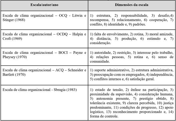 Destaca-se que o estudo sobre a primeira escala de clima organizacional teve origem nos Estados Unidos (realizada por Litwin e Stinger em 1968) e, após, outros modelos foram criados em busca da mensuração do clima organizacional (Ferreira, 2017). Apesar da existência de inúmeros instrumentos para avaliar/mensurar o clima organizacional (Quadro 1), cada organização deve adaptar o instrumento à sua realidade, devido às características únicas de cada cultura organizacional, como bem pontuam os pesquisadores sobre o tema, a exemplo de Tamayo (1999).