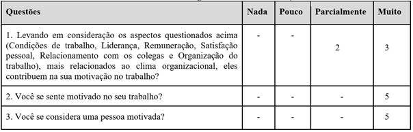Como complemento à pesquisa de clima, realizou-se um questionário com 3 perguntas fechadas e 2 abertas. O enfoque delas diz respeito à influência do clima organizacional na motivação dos trabalhadores, as quais serão apresentadas na próxima subseção.