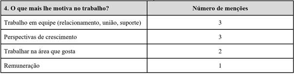 Observa-se que esta questão gerou quatro direções de respostas. O trabalho em equipe e as perspectivas de crescimento foram mencionados por três vezes, a área de atuação em duas situações e a remuneração, em uma oportunidade. Com isso, nota-se o quão necessário é o trabalho em equipe, que vai ao encontro da fala de Jungert et al. (2018), de que o trabalhador se sente motivado ao perceber harmonia no relacionamento entre colegas. Também se nota a relevância das perspectivas de crescimento para a motivação, o que reforça a afirmação de Bergamini e Coda (1997), Tamayo (1999) e Bichett e Vargas (2021) de que a valorização e o reconhecimento tratam-se de fatores externos importantes para o processo motivacional.
