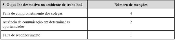 No Quadro 3 são demonstradas as respostas referentes a quinta e última pergunta da pesquisa, que questiona os motivos da desmotivação no ambiente de trabalho.