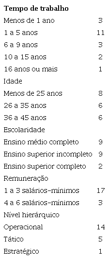 No âmbito de escolaridade, 9 participantes possuem ensino médio completo, 9 possuem ensino superior incompleto e 2 possuem ensino superior completo. A maioria (17) dos trabalhadores relatam receber de 1 a 3 salários-mínimos. Referente a cargos e níveis hierárquicos, 14 dos 20 respondentes encontram-se no nível operacional, 5 trabalham no nível tático e 1 no estratégico. Portanto, no geral, percebe-se que a predominância se dá a trabalhadores com ensino médio concluído ou superior incompleto, que trabalham nos parâmetros operacionais da organização e recebem de 1 a 3 salários-mínimos.