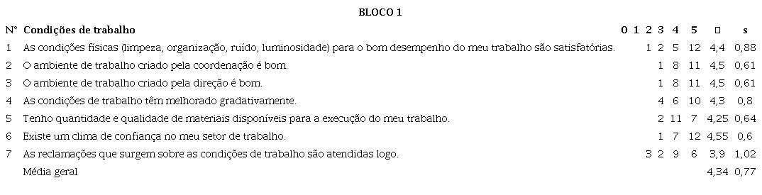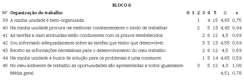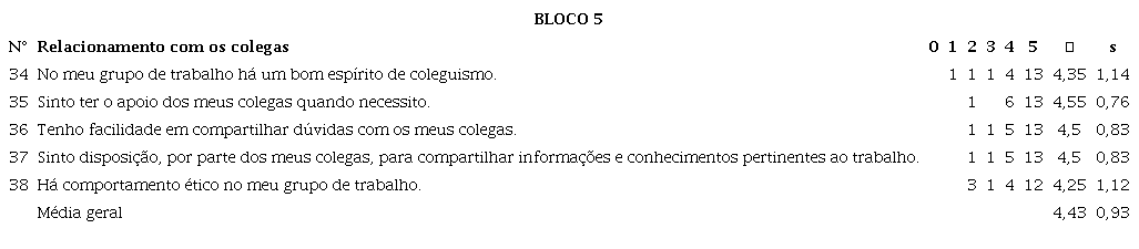 Nota-se que o item 6 “Existe um clima de confiança no meu setor de trabalho” (média 4,55 e desvio padrão de 0,60), bem como os itens 2 “O ambiente de trabalho criado pela coordenação é bom” e 3 “O ambiente de trabalho criado pela direção é bom”, respectivamente, tiveram médias de 4,50 e desvio padrão 0,61, o que reforça o aspecto do bem-estar no trabalho, que se cria tanto pelo clima de confiança, coordenação e direção. Trata-se de um sinal positivo, ao se ter em vista que os cenários das organizações são marcados por inquietudes, tanto individuais, quanto coletivas (Limongi-França, 2014).