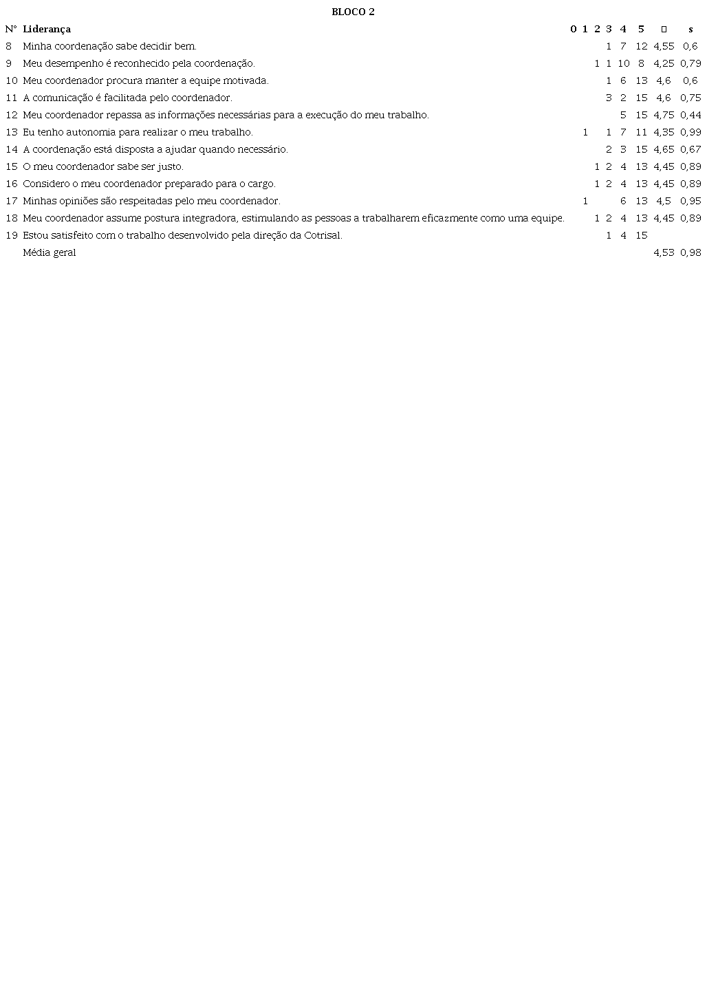 Entretanto, destacam-se as questões 12 “Meu coordenador repassa as informações necessárias para a execução do meu trabalho” (média 4,75 e desvio padrão 0,44) e 19 "Estou satisfeito com o trabalho desenvolvido pela direção da Cotrisal” (média 4,70 e desvio padrão 0,57). Tais situações reforçam a satisfação referente à comunicação, coordenação e direção, o que se observa como um aspecto animador, visto que, para Spector (2002) e Bichett e Vargas (2021) a satisfação se mostra como a causa de realizações relevantes das organizações e dos trabalhadores, tanto em desempenho quanto em longevidade.