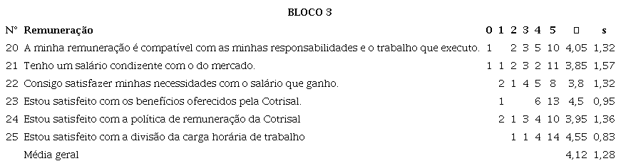 Observa-se que na Tabela 4, as percepções no que tange à remuneração alcançou uma média geral de 4,12 e desvio padrão de 1,28, o que possibilita afirmar que, de modo geral, os trabalhadores estão satisfeitos com a remuneração. De acordo com Dutra (2002) e Limongi-França (2014) a remuneração constitui o componente mais importante dos sistemas de recompensas de uma organização, já que a mesma se trata da contrapartida financeira do trabalho realizado pelo indivíduo.