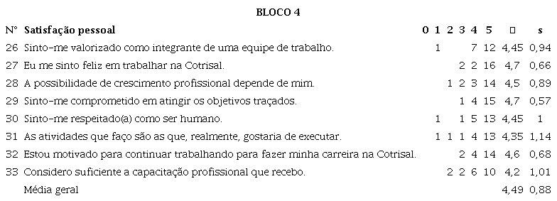 Contudo, ao analisar a tabela, percebe-se que no item 33 “considero suficiente a capacitação profissional que recebo” (média 4,20 e desvio padrão 1,01) se encontra a menor média do bloco. Por mais que o resultado não seja alarmante, essa informação possibilita à gestão da organização estudada adotar medidas diagnósticas e de ajustes no que diz respeito à capacitação e ao treinamento dos trabalhadores, uma vez que Silva e Souza (2018) ressaltam a importância dos treinamentos e do desenvolvimento dos trabalhadores em vários aspectos, (dentre eles, o pedagógico) a fim de direcionar a organização ao resultado desejado.