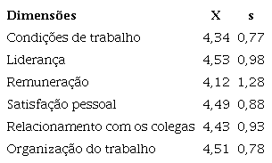 Observa-se na Tabela 2 que as condições de trabalho obtiveram uma média geral de 4,34 e desvio padrão de 0,77. Desse modo, pode-se considerar que as condições de trabalho se encontram favoráveis, por mais que não se possa desconsiderar certas condições que merecem atenção. Tal resultado é positivo, uma vez que, para Spector (2002) e Silva et al (2019), o ambiente de trabalho contribui de diversas formas para a saúde emocional e física dos trabalhadores.