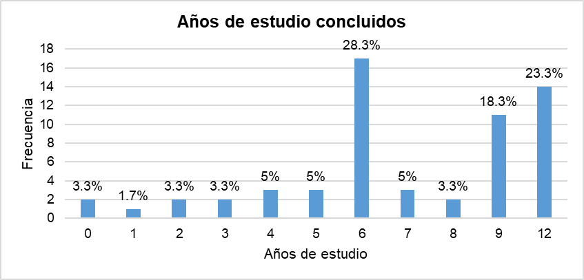 Los años de estudio concluidos presentaron una mediana de 6.50 años con un valor mínimo de 0 y un máximo de 12, estos datos se obtuvieron como criterio para la aplicación del instrumento MMSE (gráfico 1).