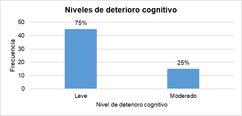 Para el instrumento MMSE la mediana se encontró en 22 puntos, lo que se traduce en deterioro cognitivo leve. El 75% (f=45) de la muestra tuvo deterioro cognitivo leve, el restante presenta deterioro cognitivo moderado (gráfico 2)