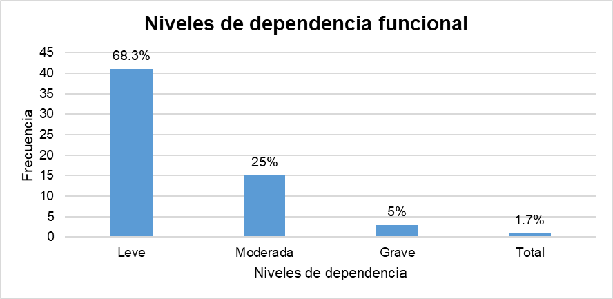 La dependencia funcional se encontró prevalente en nivel leve dentro del 68.3% (f=41), 25% (f=15) la presentaron en nivel