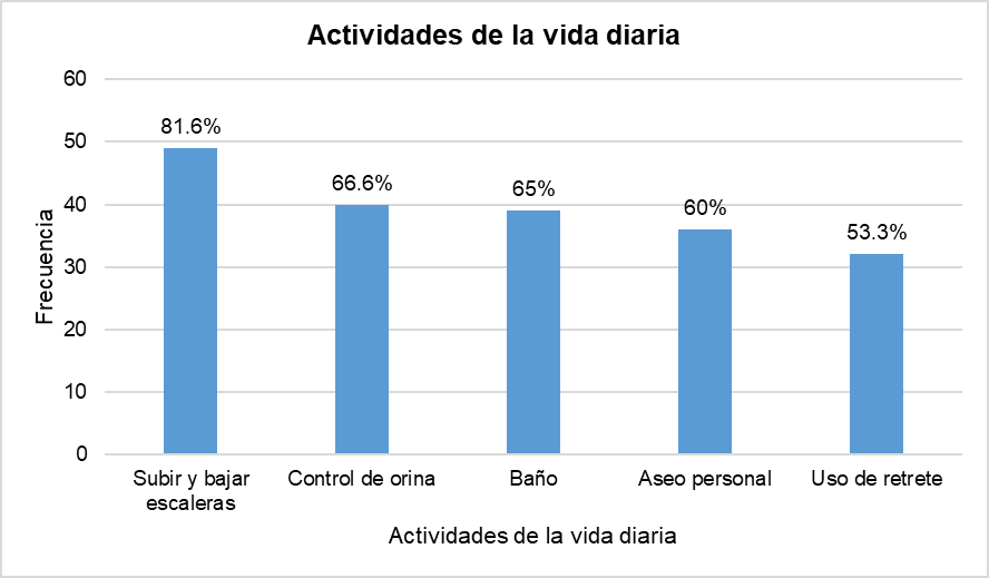 La dependencia en las personas adultas mayores es frecuente en un nivel moderado, siendo las actividades con mayor necesidad de asistencia el baño, traslado, subir y bajar escaleras y el aseo personal (14,15). En la población estudiada fue frecuente la dependencia leve manifestada con la necesidad de asistencia para subir y bajar escaleras, control urinario y control de heces.