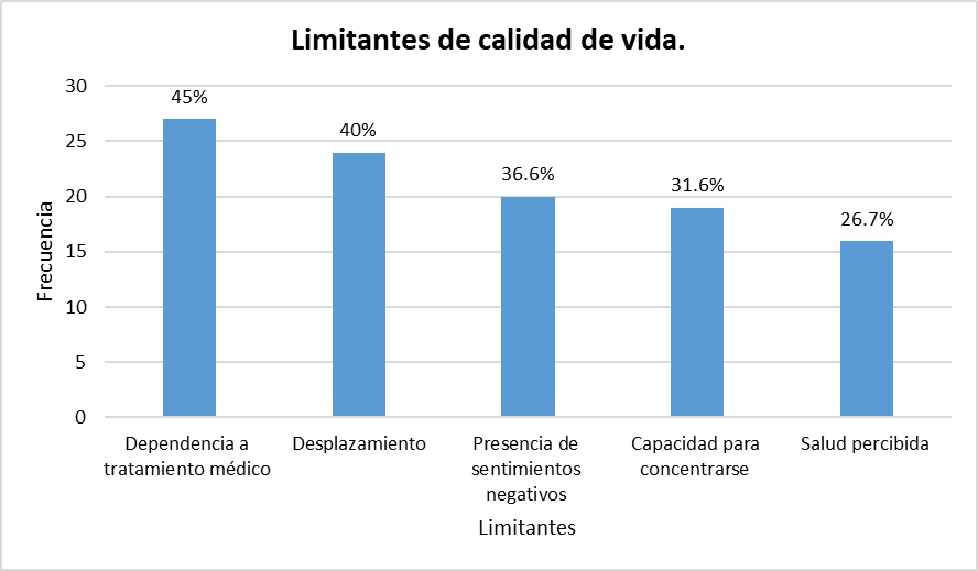 Las principales limitantes en la calidad de vida a percepción de los residentes de viviendas para personas adultas mayores fueron la dependencia permanente a tratamientos médicos, problemas para el desplazamiento y la recurrencia de sentimientos negativos, aspectos que pertenecen a las esferas de salud física y psicológica, respectivamente (gráfico 5).