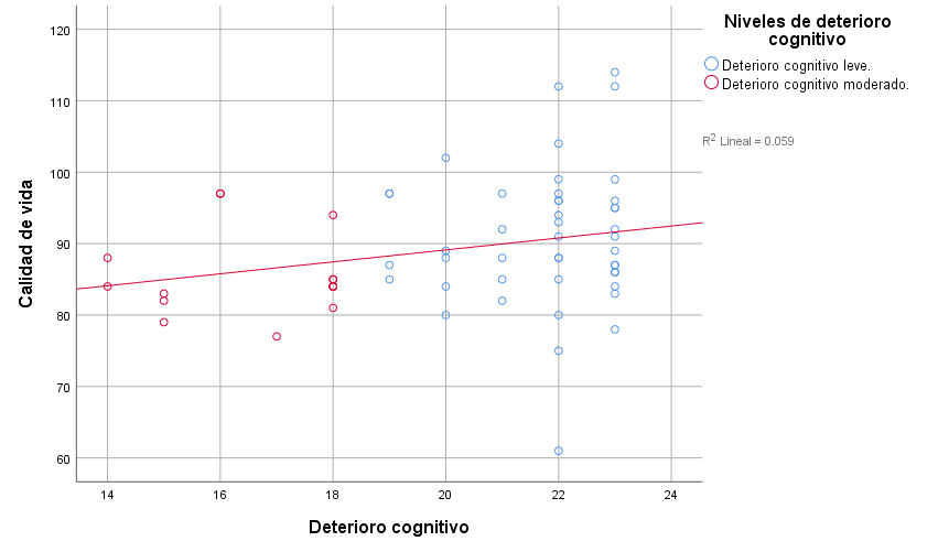 Valderrama (13) demostró la existencia de correlación entre el deterioro cognitivo y calidad de vida (r= 0.2603), enfatizando que las personas adultas mayores demuestran una calidad de vida optima mientras se mantienen activos y presentan un nivel de deterioro cognitivo leve; Acosta (22), encontró correlación positiva moderada entre dependencia funcional y calidad de vida (r= 0.464) y manifestó que la calidad de vida de las personas adultas mayores es baja cuando existe dependencia. Es coincidente en la presente investigación el aumento en la percepción sobre la calidad de vida si el nivel de deterioro cognitivo y dependencia funcional es bajo. Existe correlación positiva baja entre las variables deterioro cognitivo y calidad de vida y entre dependencia funcional y calidad de vida.