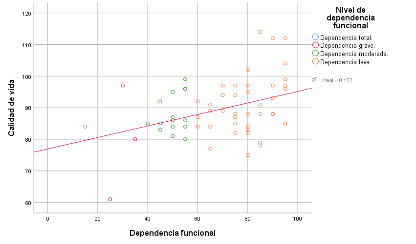La correlación entre las variables deterioro cognitivo y calidad de vida tiene una significancia de 0.05, mientras que la correlación entre dependencia funcional y calidad de vida tiene una significancia de 0.01. Ambas correlaciones tienen un coeficiente positivo bajo, lo que demuestra que los valores de estas aumentan a la par (gráfico 6 y 7).