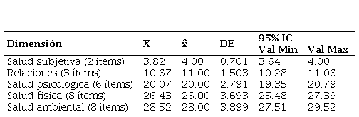 La calidad de vida global de la población fue buena, esto descrito por el 53.3% (f=32). El 40% (f=24) perciben su calidad de vida como ni buena, ni mala, el 5% (f=3) como muy buena y 1.7% (f=1) como mala. En las dimensiones evaluadas resaltan medias proporcionales al número de ítems (tabla 3).