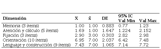 Las dimensiones cognitivas evaluadas mantuvieron una media dentro del intervalo de confianza establecido a priori en 95%. La media obtenida fue proporcional al número de ítems por dimensión.