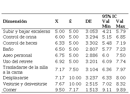 La habilidad para las actividades básicas de la vida diaria se puntúo entre 0, 5 y 10, que significan respectivamente, dependencia total para la actividad, requiere de ayuda e independiente para la actividad. La sumatoria de las respuestas se clasificó en: ausencia de dependencia (100 puntos), dependencia leve (95 a 60 puntos), dependencia moderada (55 a 40 puntos), dependencia grave (35 a 20 puntos) y dependencia total (0 a 15 puntos).