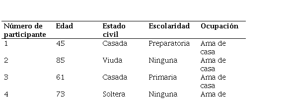 La totalidad de la población participante son del sexo femenino, debido a dos factores principalmente: 1) disponibilidad y 2) uso y conocimiento de la MAC. El 50% son adultas mayores. El 50% son casadas. El 33% no tienen escolaridad alguna y la misma proporción cuenta con la primaria concluida. Finalmente, el total de las participantes son amas de casa (Tabla 1).