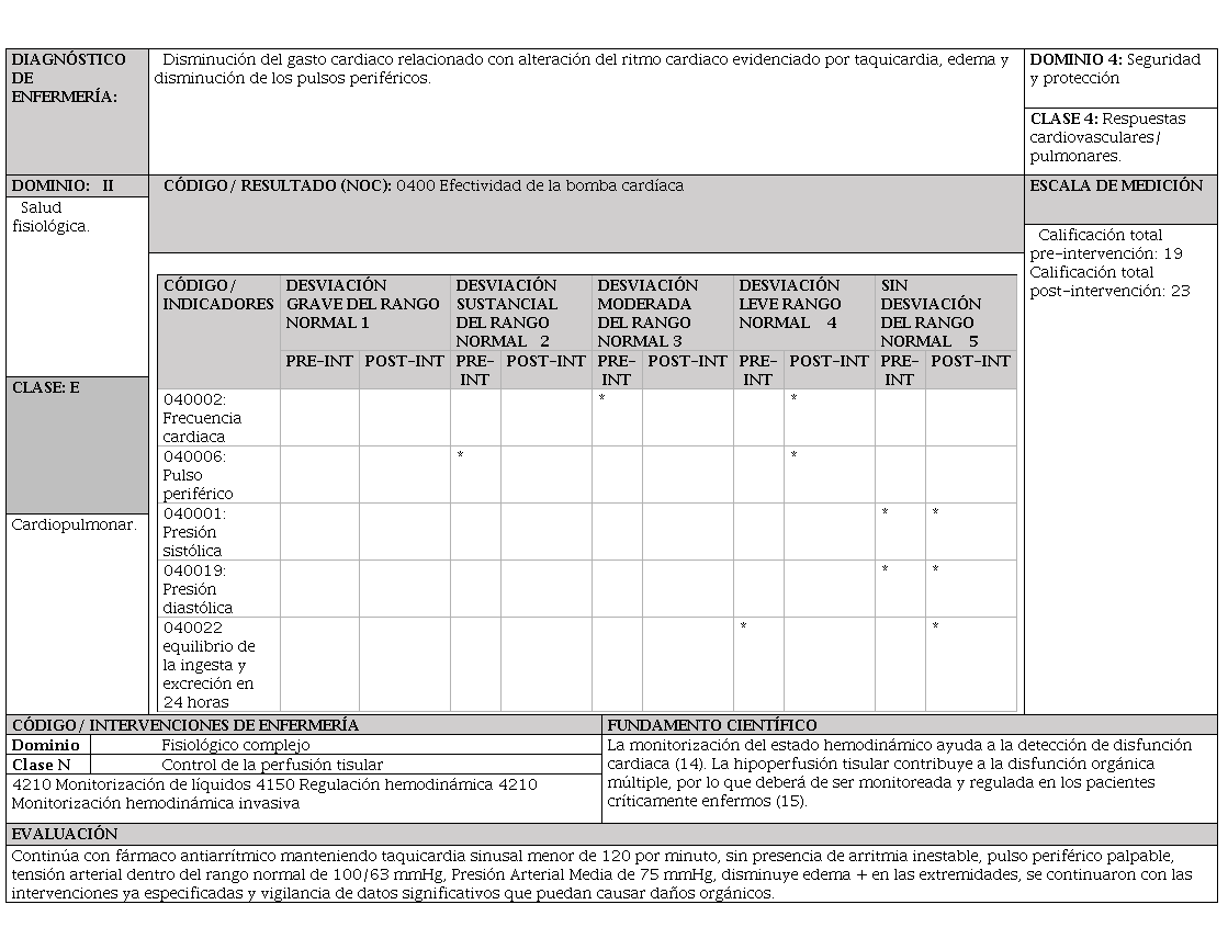Se prosigue con los siguientes diagnósticos enfocados en el problema, limpieza ineficaz de las vías aéreas, disminución del gasto cardiaco y exceso de volumen de líquidos. Una vez ejecutadas las intervenciones se evidencia que se logra mantener una vía aérea permeable y adecuada ventilación, la tensión arterial dentro de los rangos normales, con taquicardia sinusal y en el diagnóstico de exceso de volumen de líquidos, el edema disminuyó de nivel ++ a un +. Por otra parte, en el estado nutricional, aunque presentó pérdida de peso, la paciente mantuvo un IMC normal, en déficit del autocuidado: baño, fue necesario realizar las intervenciones para el confort y cuidado de la piel. Los diagnósticos de riesgo identificados fueron riesgo de infección de la herida quirúrgica y riesgo deterioro de la integridad cutánea, las medidas de prevención mantuvieron la integridad de sus tegumentos y libre de infección.