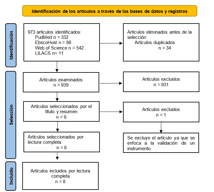 Se identificaron un total de 973 artículos con la estrategia de búsqueda en las 4 bases de datos seleccionadas, de los cuales, 34 artículos se encontraron duplicados. Luego de leer los títulos y los resúmenes, se excluyeron los estudios que no cumplieron con los criterios de inclusión (se enfocaban a otros grupos etarios como niños y adolescentes o no abordaban las conductas alimentarias), quedando un total de 9 artículos. Tras el análisis completo del texto, se emplearon 8 artículos (ver Figura 1).