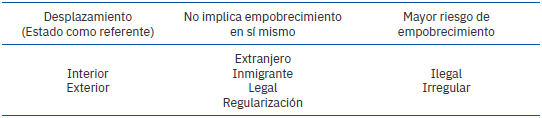 En quinto lugar, existe una relación entre el tipo de migración que se up produce y las situaciones de pobreza, entendiendo esta como un estado de necesidades básicas no cubiertas, de modo que las migraciones no son susceptibles de producir pobreza en sentido estricto, o por lo menos desde el sentido material. Así la carencia de factores como acceso a agua, salud, educación, dependencia económica y vivienda dentro del proceso migratorio empobrecen.