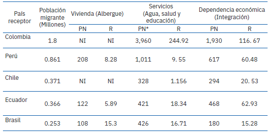 Una vez definidos los cinco sectores escogidos del (Plan Regional de Respuesta para Refugiados y Migrantes de Venezuela 2020), es posible identificar las cifras para cada país del top 5 de mayores receptores.