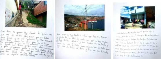 La primera vez que vine se me hizo muy raro porque había esas lomas y se veía estresante y fue estresante subir esas lomas tan altas", "en cambio que allá (su pueblo natal), no hay montañas y hay muchos árboles y los árboles son de fruto y acá no", "Tomé esta foto porque me parece muy distinta esa casa a la de nuestro pueblo y son muy diferentes, demasiado diferentes. Allá casi todas las casas son de madera y unas de ladrillo. (Juan Carlos, Mauricio y Nayeli. Mayo de 2015).
