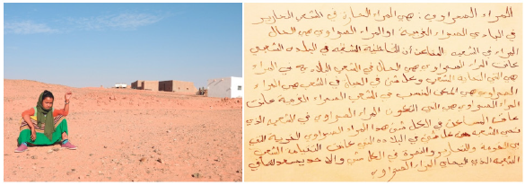 Finalizada esta parte, los facilitadores descargaron el material fotográfico en la computadora y cada participante escogía una sola foto. Posteriormente, procedieron a realizar la narración escrita de la misma, explicando de manera más descriptiva lo que significaba esa imagen para ellos. Esta narración está escrita en su idioma originario, hassanía (dialecto árabe), por decisión consensuada entre los mismos participantes. Cuando se llevó a cabo la presentación de las fotografías se realizó un registro de las narraciones en castellano.