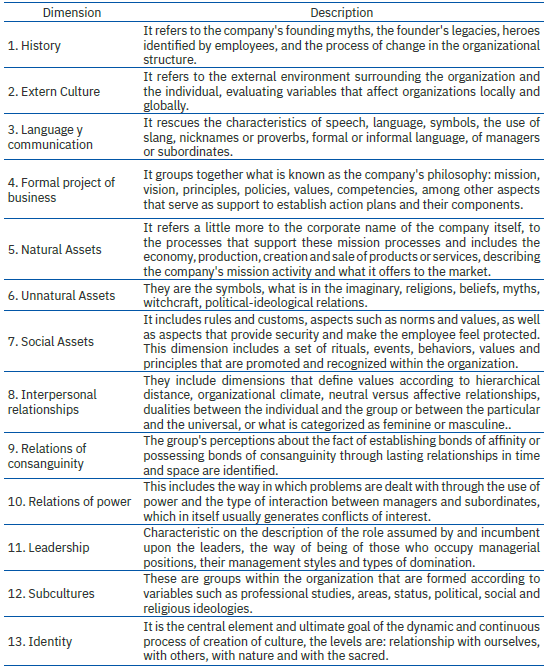 Likewise, the model of Zapata, Rodriguez & Sanchez (2008) is used to analyze organizational culture, it is divided into 13 dimensions, which are detailed below (Table 1):