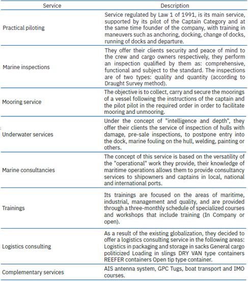 The company under study is working for the provision of services of local, national and global scope, its capital is private and its mission is to provide quality services with a select staff of professionals in various areas, highlighting their experience of over 30 years. The services offered based on information provided by the company are (Table 4):