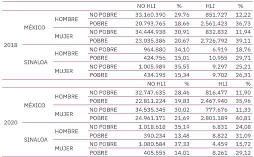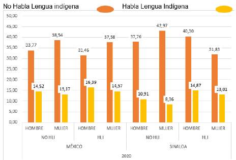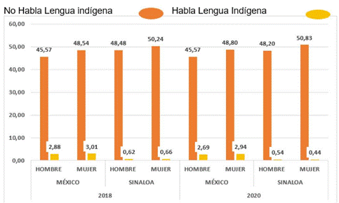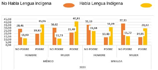 En primer lugar, se deduce que la población indígena representa alrededor del 5.7% de la población total de México, y en el Estado de Sinaloa se observó una reducción de aproximadamente el 0.3% de la población indígena durante la pandemia por Covid-19. En ese mismo Estado, las mujeres indígenas son aproximadamente un 2% al 3% menos pobres que los hombres indígenas, mientras que en el resto del país esta tendencia es inversa. Sin embargo, la pobreza en las mujeres indígenas es el doble en comparación con las mujeres no indígenas.
