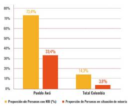Estos resultados analizados determinan que la población colombiana con NBI es reconocida en un 14,3%, frente a la población AWA que tiene una diferencia de 59,1 puntos porcentuales: y la población colombiana en situación de miseria es 3,8%, que al ser comparada con la población Awá presenta una diferenciación de 29,6 puntos porcentuales. Es decir, la población Awá presenta mayores porcentajes de NBI y de situación de miseria que la población total nacional de Colombia.