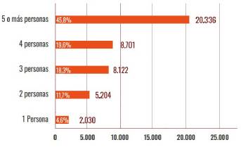 El 83,7% de los habitantes de la comunidad Awá según el CNPV (2018), integran hogares de 3 o más personas, a su vez el 45,8% conforman a hogares de 5 a más individuos, y el 19,6% conforman hogares de 4 personas, frente a un 18,3% que conforman hogares de 3 personas.