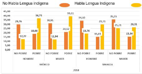 En 2018, las mujeres indígenas presentan una menor pobreza que su contraparte masculina, estos últimos presentando una mayor pobreza que las mujeres indígenas, pasando al nivel nacional tanto en hombres como en mujeres, que no pertenecen a la población indígena, podemos ver como los índices de pobreza se ven reducidos a solo un 18% a 20%.