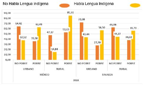 En cuestiones de la población indígena como se puede observar en la tabla y gráfica, que antecede, la población indígena se encuentra mayor mente en zonas rurales, ya que en el Estado de Sinaloa en 2018, la población indígena que se encontraba en zonas rurales mostraba un índice de pobreza del 55.73%, mientras que la población indígena en zonas urbanas, mostraba índices de pobreza del 56.56% mostrando que la zona rural o urbano, no hace una diferencia significativa o positiva en la pobreza de este grupo de la población mientras que a nivel nacional en 2018, las índices de pobreza en la población indígena en poblaciones rurales pasa del 55.73% al 85.16% viendo un aumento significativo pasando de un panorama estatal a nacional mientras que en la población no indígena las índices de pobreza en zonas rurales son solo de 38.02%, esto nos dice que la población indígena a pesar de encontrase en una zona rural, tiene más posibilidades de ser pobre que una persona que no pertenece a esta población.