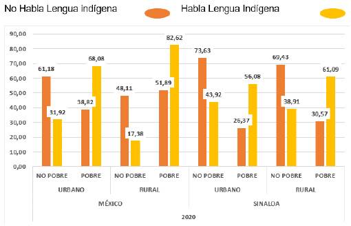 A nivel nacional, las diferencias de pobreza en la población indígena entre zonas urbanas y rurales eran del 23% en 2018 y del 14% en 2020. Sin embargo, esto se debió a un aumento del 7% en la pobreza en la zona urbana. La proporción de jefas de familia indígenas en Sinaloa pasó de una proporción de 4:1 en 2018 a 2:1 en 2020. A nivel nacional, estas proporciones fueron de 3:1 en ambos años. Se observa una participación más activa de las mujeres indígenas y no indígenas de Sinaloa en las jefaturas del hogar, incluso por encima de la media nacional.
