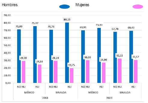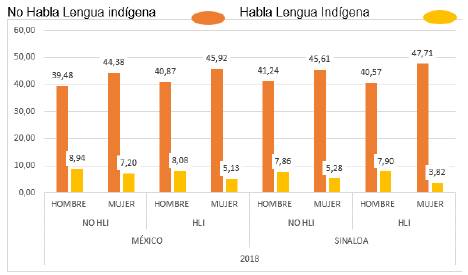 Los datos muestran que en el estado de Sinaloa, en 2018, el índice de pobreza entre las mujeres indígenas es del 26.31%, mientras que entre los hombres indígenas es del 29.71%. A nivel nacional, las mujeres indígenas presentan un índice de pobreza del 39.11%, mientras que los hombres indígenas tienen un índice de pobreza del 36.73%.