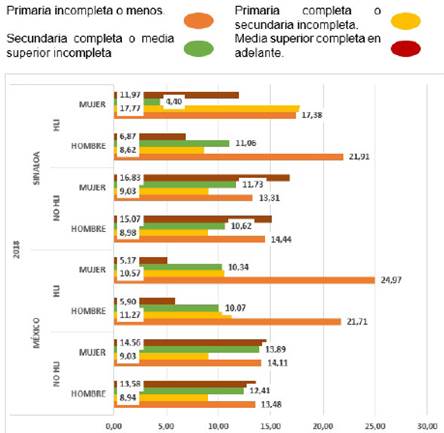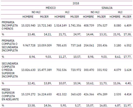En 2018, podemos ver en la población indígena de mujeres, un grupo que no presenta una carencia real o muy marcada con respecto a su contraparte masculina o a la población en general, mientras que la población general que no es indígena no marca una desigualdad real, pudiendo ver una igualdad de una población a otra, de un sexo a otro, del Estado de Sinaloa a todo el territorio de México en general, a su vez vemos en todo la población un margen porcentual de carencia del 3.82% al 8.94% siendo relativamente bajos en todos los grupos de población.