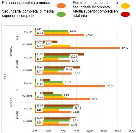 En 2020, podemos observar un cambio significativo en el nivel educativo de las mujeres indígenas, en educación media superior o más completa, presentando una decaída del 11.97% en 2018 al 2.54% en 2020. En general el hombre indígena presenta un mayor porcentaje de educación en casi todos los niveles que se categorizan en la gráfica, mientras que en la población en general podemos ver índices un poco más homogéneos o firmes, observando variaciones no muy grandes de un periodo a otro.