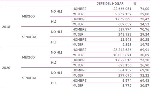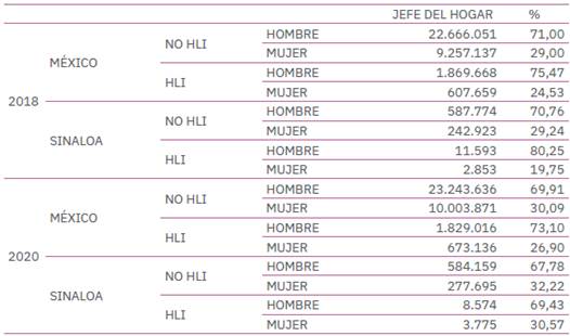 En el periodo 2018, en el Estado de Sinaloa podemos observar que, solamente el 19.75% de la población de mujeres indígenas son las jefas de sus hogares, mientras que en 2020 se observa un aumento hasta el 30.57%, y en general si observamos la tabla podemos ver en todos los casos no solo en la población de mujeres indígenas, son mayormente los hombre los jefes del hogar, los que perciben el mayor ingreso y es el sostén del hogar, viendo como estos superan a su contra parte femenina con más del doble, esto quiere decir que por cada mujer ya sea indígena o no, que es jefa de su hogar hay más de 2 hombres que son los jefes del hogar, en general México es un país algo tradicionalista, donde los roles de género aun juegan un papel significativo en los hogares y en las posibilidades que una persona puede llegar a tener ya sean personales o profesionales.