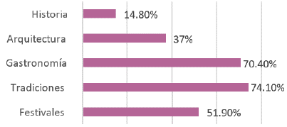 De acuerdo a la Gráfica 1, se toman en cuenta aquellos aspectos que a los tu ristas les parecen más atractivos para visitar los pueblos y zonas pertenecientes al estado de Michoacán, entre los que destacan las tradiciones y su gastronomía, siendo marcados por una mayor concentración de porcentaje de encuestados.
