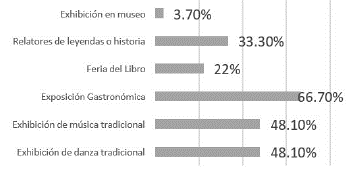 A partir de los resultados presentados en la Gráfica 2, se muestra que los visi tantes de Michoacán con motivos turísticos prefieren apreciar exposiciones gas tronómicas y de danzas o música tradicional en sus visitas.