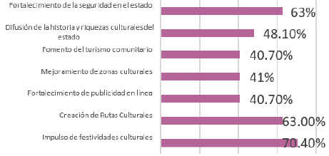 Es necesario conocer los factores principales que los turistas toman en cuenta para mejorar su experiencia en el Estado, por ello, en la siguiente Gráfica 3, se muestran aquellas medidas que los encuestados consideran, podrían mejorar la promoción del turismo cultural en Michoacán, destacando por su mayor concen tración de porcentajes, el impulso de las festividades culturales y el fortalecimien to de la seguridad en el estado.
