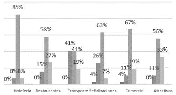 De acuerdo con Páez (2020, la infraestructura turística es el conjunto de ins talaciones físicas y dotación de bienes y servicios de un país o región destinada a atender visitantes extranjeros. Es importante conocer la experiencia de los visi tantes del estado en cuanto a diversas áreas de este sector e identificar aquellas que se puedan potenciar, por ello, en la Gráfica 4, se ilustra el nivel de satisfacción que tuvieron los encuestados en cuanto a distintos elementos de servicio turístico por parte de Michoacán, mostrándose más de acuerdo en la experiencia favorable ofertada por la hotelería y comercio.