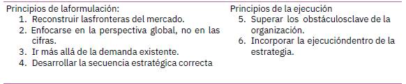 Se establecen seis principios: los cuatro primeros giran en torno al desarrollo de la estrategia para llegar al océano azul. Los últimos dos consideran la ejecución de la estrategia. En suma, todas conducen a la empresa acerca de cómo hacer la ejecución efectiva y eficaz a parir de las ideas generadas del océano azul, para ge nerar un crecimiento fuerte y sostenido (Arredondo, 2015).